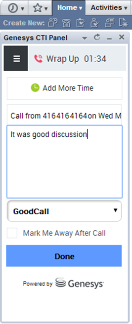 - Click Done when finished with the call. If the dial pad is viewed from the customer or transaction record, then a phone call with the wrap-up information is created for the customer or the transaction's entity record. For more information, see Managing Phone Logs