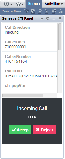 For inbound calls, the panel displays the call details and an Incoming Call dialog box. Accept or reject the call from your phone.