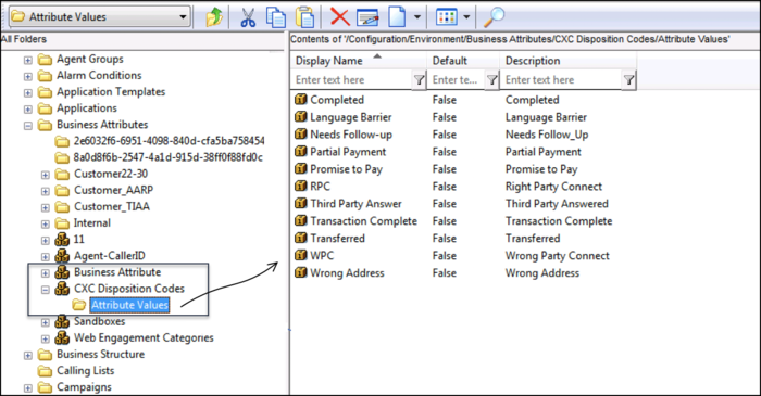 First, create a business attribute in the Configuration Manager section of the configuration environment (Platform Administration or Genesys Administrator Extension). In the Business Attribute Values folder, create the list of disposition codes that you want to populate in CX Contact when you define the treatment.