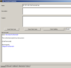 Ordinarily when including the transcript of a chat session in an e-mail, the transcript is appended to the end of the e-mail. To insert the transcript somewhere else, place the tag [ChatTranscript] where you want the transcript to appear. You can do this in the plain text or the HTML version or both. The following figure shows an example (click to enlarge).