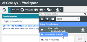 When you are consulting with someone else in your company, the Team Communicator shows you a list of your active consultations to make it quick for you to choose who to transfer or conference the interaction to, or who to add a different type of consultation (voice or chat). If you want to perform a warm transfer or a two-step transfer, click Consult to talk to the consultation target and then click Transfer to transfer the call.
