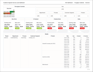 - Summary tab — This tab provides a high-level summary, presenting a summary for each product, for the entire reporting period, as a single line item, and provides representations of work completed broken out by Product, Department and Process, and Customer Segment. It provides a Day slider, which you can use to quickly focus on a given day or range of days.