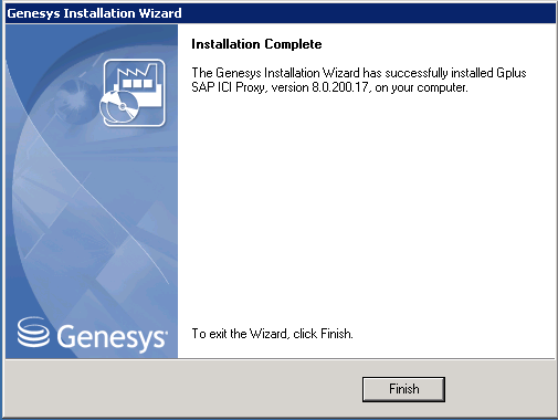 - Click Install. The Genesys Installation Wizard indicates that it is performing the requested operation. When completed, the Installation Complete screen appears.