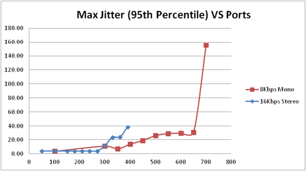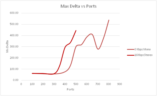 The above results show that an 8 Kbps configuration uses less CPU and memory, with lower latencies of observed for Max Jitter and Max Delta, which achieves higher capacity. For example, there was a 28.6% increase in capacity (450 vs 350 ports) for preferred ports, and a 33.3% increase in peak capacity (600 vs 450 ports) when using 8 Kbps Mono compared to 16Kbps Stereo.