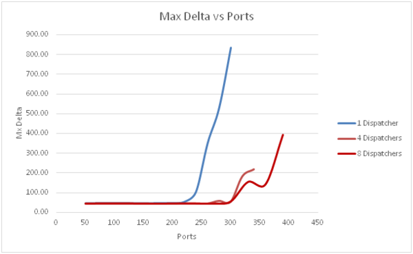 Results from four-dispatcher and eight-dispatcher configurations show significant improvement, when compared against the default of one dispatcher. Additionally, the results with eight dispatchers show slightly better results than with four dispatchers.