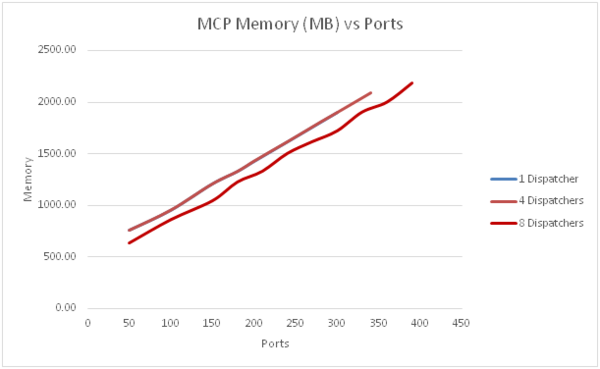 Memory usage for four-dispatcher and eight-dispatcher configurations is similar, with eight dispatchers using slightly less memory. Genesys recommends the eight-dispatcher configuration. Comparing eight dispatchers to the default one dispatcher reveals a 36% increase in preferred capacity (300 vs 220 ports); eight dispatchers achieved a 50% increase in peak capacity.