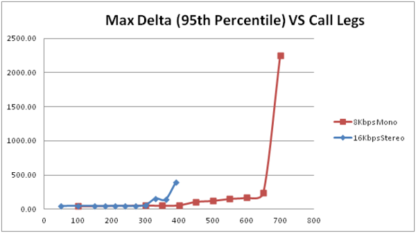 The same trend was seen on Linux as was seen on Windows—slightly lower CPU usage for 8 Kbps Mono, lower latencies for both Max Jitter and Max Delta, thereby achieving higher capacity.