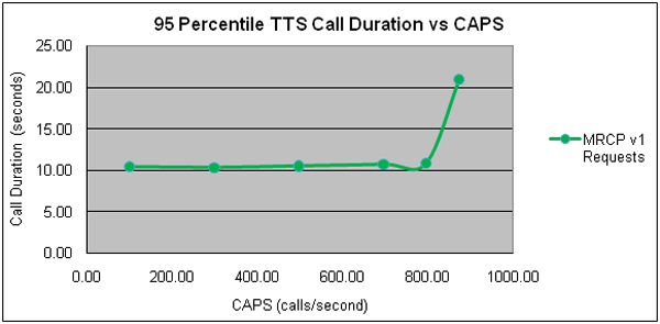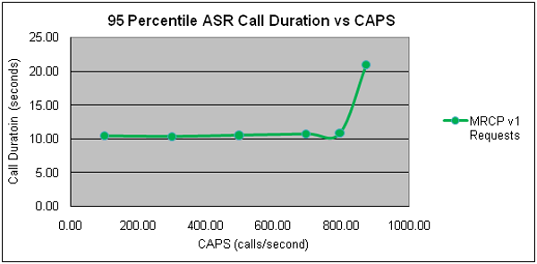 The peak capacity is achieved at 1,600 concurrent MRCP requests per second (half ASR and half TTS) in CAPS, but the MCRP Proxy can hold 16,000 MRCP sessions in total. Beyond 1600 CAPS, it might still respond. However, the entire session becomes quite lengthy and will eventually time out. Figure: ASR Call Duration Versus CAPS—MRCP Proxy (MRCPv1) and Figure: TTS Call Duration Versus CAPS—MRCP Proxy (MRCPv1) depict the ASR and TTS 95th percentile of call duration. The results indicate that the call duration beyond 800 CAPS more than doubles.
