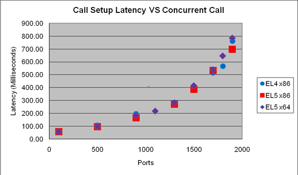 Because performance suffers on RHEL 6.4 x64, the virtual environment was used only to test MCP on RHEL 6.x x64 as a guest OS on ESXi 5.0. Below is the comparison of call setup latency between EL5 x64 and EL6 x64 while both were on virtual environment as guest a OS: