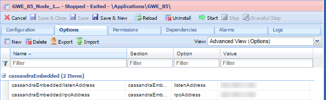 To configure embedded Cassandra, select the Options tab. In the [cassandraEmbedded] section, set the values for listenAddress and rpcAddress, using a fully qualified domain name or the appropriate IP address. - (Optional) In the[log] section, the all option is set to stdout by default. Enter a filename if you wish to enable logging to a file. For example, you can enter stdout, C:\Logs\WebEngagement\GWE_Node1 to force the system to write logs in the console and in a file called GWE_Node1.log.