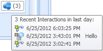 If there are recent interactions for the current contact; the number of interactions is displayed beside the connection status of the interaction. Place your mouse pointer over the icon to display the number and type of recent interaction(s) for the current contact. If you click the icon, the Contact view is opened and the History tab is displayed. Your system administrator defines the contents as interactions in the last-specified number of days.