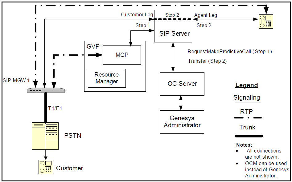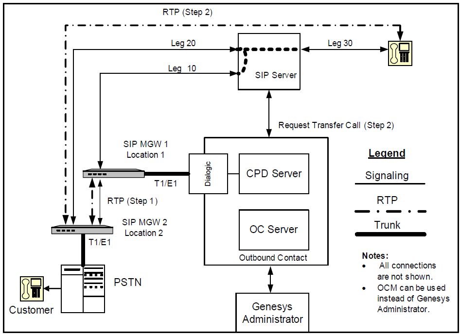 - Using SIP Server as a dialer and Trunk Group DN as the DN on behalf of which OCS originates calls with Genesys Media Server to perform CPA in Transfer and Active Switching Matrix (ASM) modes.