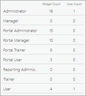 The number of users and widgets (features and pages accessible to a role) associated to the Role is visible under User Count and Widget Count.