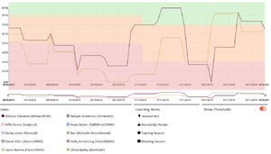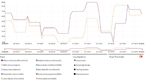 The timeseries graph shows the scores of the users selected, with their colors represented in the Users legend below it and learning items shown on the line, with the shapes corresponding to the Learning Items legend. The threshold is overlaid and shows which bands were active at the times on the graph.