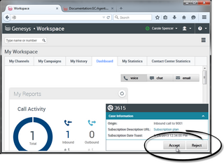 thumb|center|A notification is displayed on your desktop when an interaction is directed to you. Make sure your softphone or phone device is connected and you are wearing it, then click Accept to answer