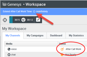 - Your account might also be set up to enable you to extend your after call work time indefinitely. This is useful if you have a call that requires more than the usual amount of after call work. If your account is set up to extend after call work, a notice with a radio button is displayed above the Interaction Bar. Click the "indefinitely" button to extend your after call work time until you set your status to another state, such as Ready.