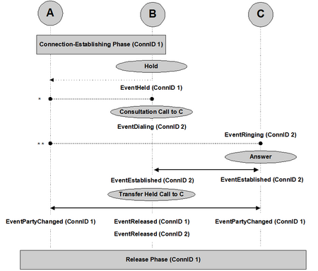 The following graphic and table describe a two-step transfer: complete after the consulted party answers.