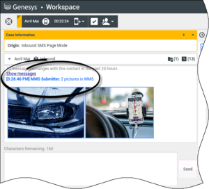 Multimedia Message Servive (MMS) is a multi-media component of voice and Internet communication. In Workspace, MMS enables you to receive images sent to your contact center from a mobile device, a web interface, or an email client. Images are displayed to you as thumbnails. To view the image full-size, double-click it or right-click it and select Open from the context menu. It will open in the default application specified in the Windows operating system. If you have the correct permissions, you can click the Save icon or right-click an image and select Save from the context menu to save it. [Added: 8.5.110.13]