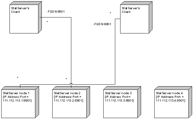 Generally speaking, this approach is based on a well-known principle when all clients use the same Fully Qualified Domain Name (FQDN) of the server’s host and receive real and different IP addresses from the DNS service—the entity responsible for balancing connections. The problem with this approach, however, is that all Stat Server nodes end up sharing the same IP address (but with different ports)—this is because all Stat Server nodes must run on the same host.