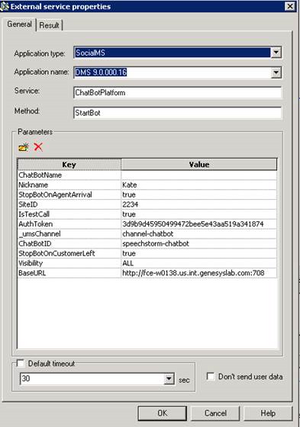 - Set the value of the chatbot option to point to the load balancer for Messaging Server. If you want to set timeout values, add the parameters downstream_request_timeout_millis and session_timeout_minutes. In the following example, the request timeout is 120000 ms (120 seconds) and the session timeout is 30 minutes: