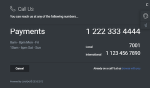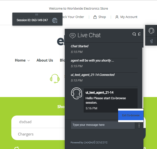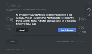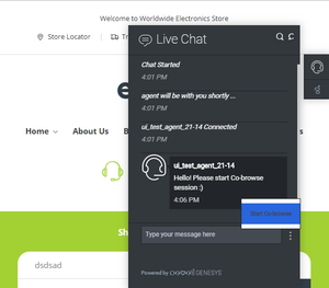 A customer can also initiate a co-browse session through a Genesys Widget integrated into the website. You can enable Genesys Co-browse in several Genesys Widgets, for example: