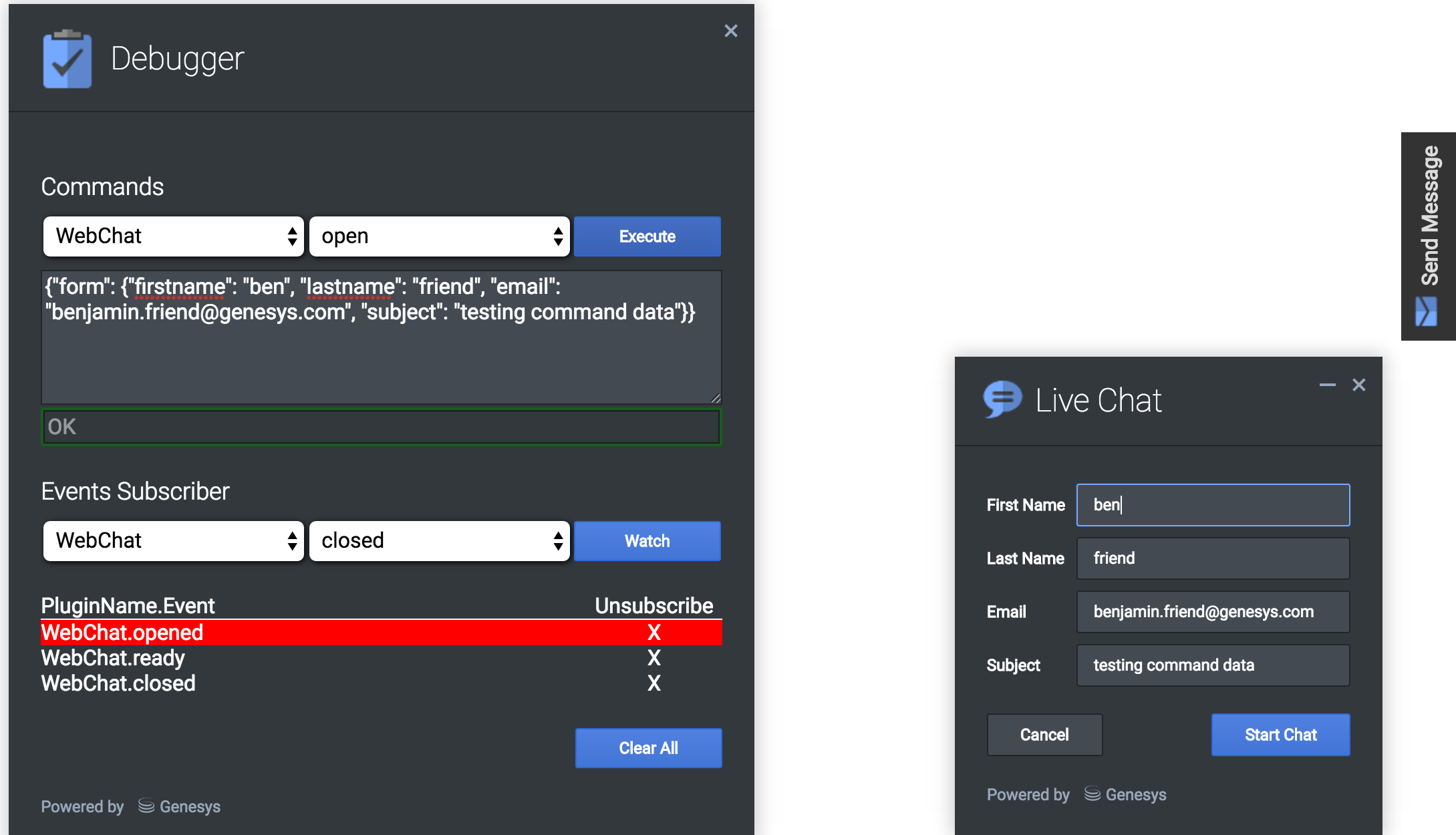 The Console Widget is a tool for debugging commands and events on the widget bus. You can test, debug, or demo all commands using dynamically populated lists and create event watchlists that alert you when an event has fired.