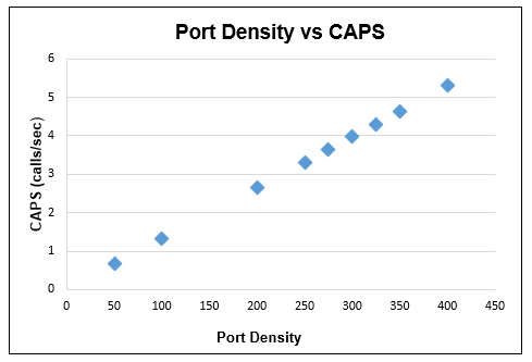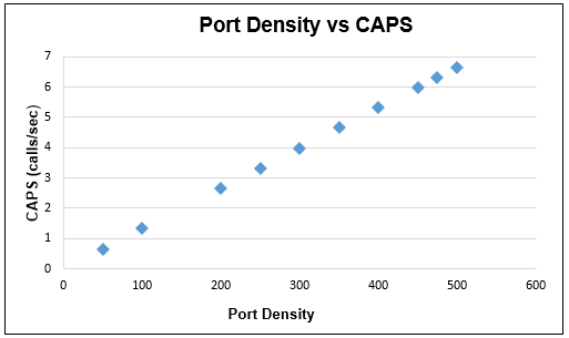 Figure: Port Density versus CAPS (Announcement) illustrates that, as the call duration increases with higher port density, the additional call setup and tear down latency prevents the CAPS from scaling linearly in relation to the port density.