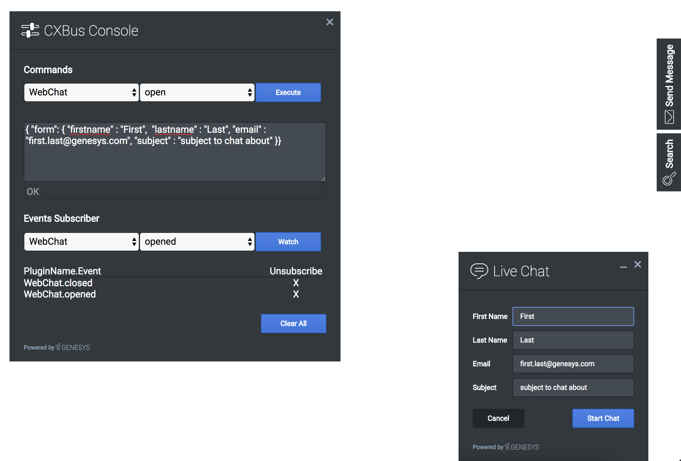 The Console Widget is a tool for debugging commands and events on the widget bus. You can test, debug, or demo all commands using dynamically populated lists and create event watchlists that alert you when an event has fired.