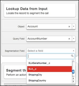 Call segmentation in VCC Salesforce allows you to route customer calls based on the Salesforce data — your Customer Service department wants to segment the calls according to the service level agreement (SLA). With a routing template configured to request the caller's account number, VCC Salesforce can locate the correct record in Salesforce and then route the call based on the value it finds in the SLA field — Platinum accounts can go to one skill or queue and Gold accounts to another. Using this example, the following section explains the call segmentation parameters and then provides implementation tips: